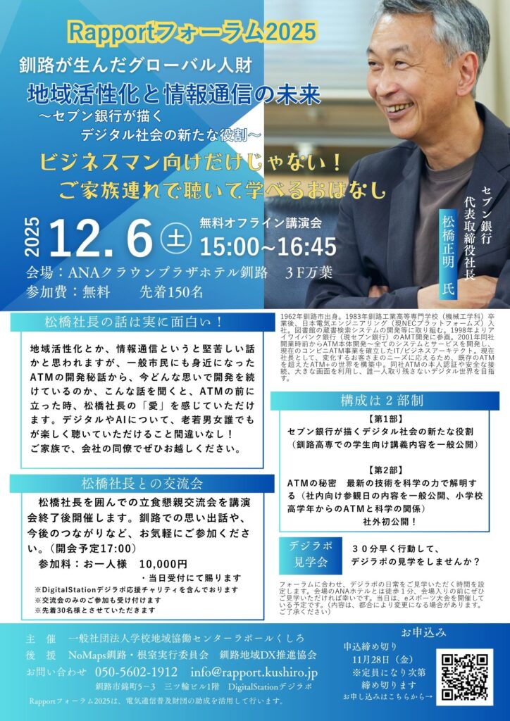 釧路路出身でセブン銀行代表取締役社長の 松橋正明氏 をお招きし、「Rapportフォーラム2025」を開催します!